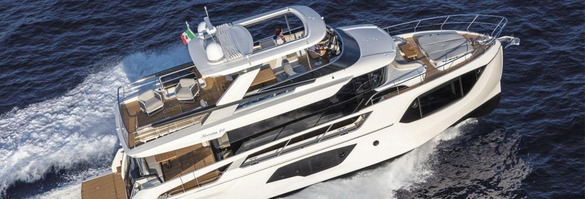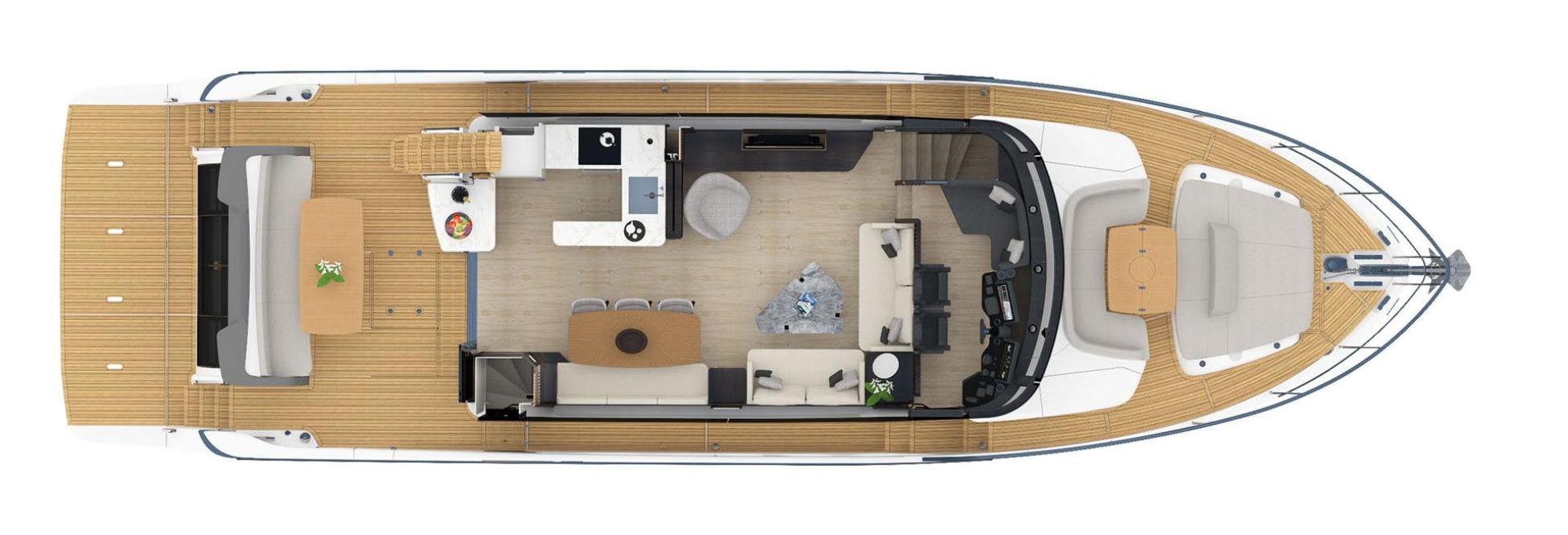 飛橋甲板(Flybridge)的寬度遠超市面上任何其他 64 呎遊艇。在主甲板上,沙龍區被無框玻璃窗環繞,提供令人屏息的全景視野。舒適的沙發、大餐桌、娛樂區,以及易於與艉阱(Cockpit)連結的廚房,讓一切更臻完美。整個主甲板由架高的駕駛台俯瞰,配備超過 10 英尺(約 3 公尺)的巨型弧形無框擋風玻璃,提供絕對清晰的視野。在下層甲板,主臥艙(Master cabin)位於船首,配備特大雙人床(King-size berth)、大型側窗及全寬度衛浴。貴賓套房(VIP suite)的表現尤為出色:其宜居性令人驚嘆,選材更是精緻絕倫。此外,第三間客艙為配有兩張單人床的雙人房。最後,所有艙房均配有專屬的套房式衛浴(En-suite heads)。